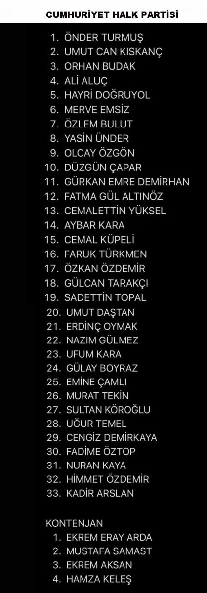 Yüksek Seçim Kurulu’nun (YSK), yerel seçim aday listeleri için siyasi partilere verdiği süre bugün (20 Şubat 2024) saat 17:00'da doldu. Cumhuriyet Halk Partisi’nin (CHP), onaylanan listesi YSK’ya sundu.
